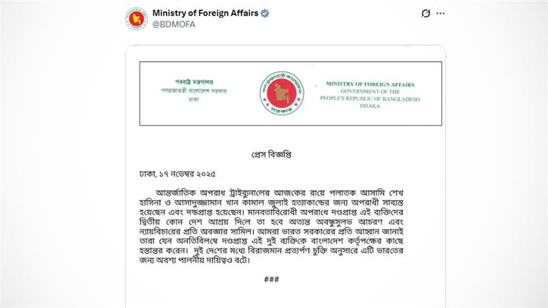 సోమవారం, నవంబర్ 17న బంగ్లాదేశ్ ప్రభుత్వం ఒక కీలక డిమాండ్ను భారతదేశానికి అధికారికంగా పంపింది. గత సంవత్సరంలో విద్యార్థుల ఉద్యమాన్ని అణచివేయడంలో పాత్ర పోషించినందుకు ఉరిశిక్ష విధించబడిన మాజీ ప్రధానమంత్రి షేక్ హసీనా, మాజీ గృహ మంత్రి అసదుజ్జమాన్ ఖాన్ కమల్ లను భారత్ అప్పగించాలని ఢాకా కోరింది. బంగ్లాదేశ్ విదేశాంగ మంత్రిత్వ శాఖ విడుదల చేసిన ప్రకటనలో.. ఇటీవల వచ్చిన తాజా తీర్పులో, జూలై సంఘటనల్లో జరిగిన దారుణ మారణహోమానికి సంబంధించిన కేసులో పారిపోయిన హసీనా, అసదుజ్జమాన్ ఖాన్ కమల్ దోషులుగా తేలి శిక్షించబడ్డారని పేర్కొంది. మానవత్వానికి వ్యతిరేకంగా చేసిన నేరాలకు పరారైన వ్యక్తులకు మన ఏదైనా పొరుగు దేశం ఆశ్రయం ఇవ్వడం స్నేహపూర్వక నైతికతకు విరుద్ధం. ఇది న్యాయ ప్రక్రియను అవమానపరచే తీవ్రమైన చర్య. అందువల్ల, ఈ ఇద్దరు దోషులను వెంటనే బంగ్లాదేశ్ అధికారులకు అప్పగించాలని మేము భారత్ను గట్టిగా కోరుతున్నాము. రెండు దేశాల మధ్య ఉన్న అప్పగింత ఒప్పందం ప్రకారం భారతదేశం దీనిని గౌరవించాల్సిన బాధ్యత ఉందని ప్రకటనలో కోరింది.